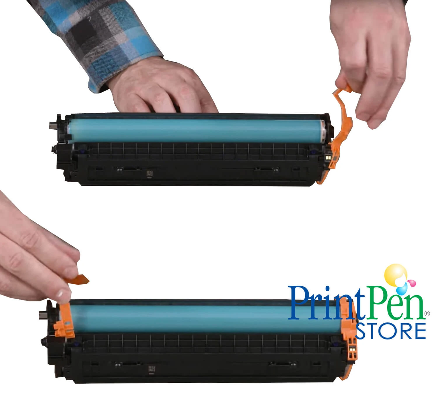 Yeni bir HP 150A toneri çöp kutusunun üzerinde açmanızı öneririz (Biten toner yerinden sökülürken bir miktar toner tozu dökülebilir) Yeni bir toner kartuşunu kutudan çıkarın ve kartuşun etrafındaki karton ve plastik poşet ve ambalajı çıkarın. Kartuşun ucunda plastik koruma klipsi bulunmaktadır, bu klips Kargoda ve nakliyede taşıma esanasında, kutulara çok kibar davranılmadığı için toneri korur ancak bu klips takılı olarak yazıcıya sığmaz Lütfen zorlamayanız!! Klipsi çıkarın ve atın. Daha sonra tonerinizi yazıcıya hazırlamak için kartuşu çöp kutusunun üzerinde yavaşça ileri geri sallayın.